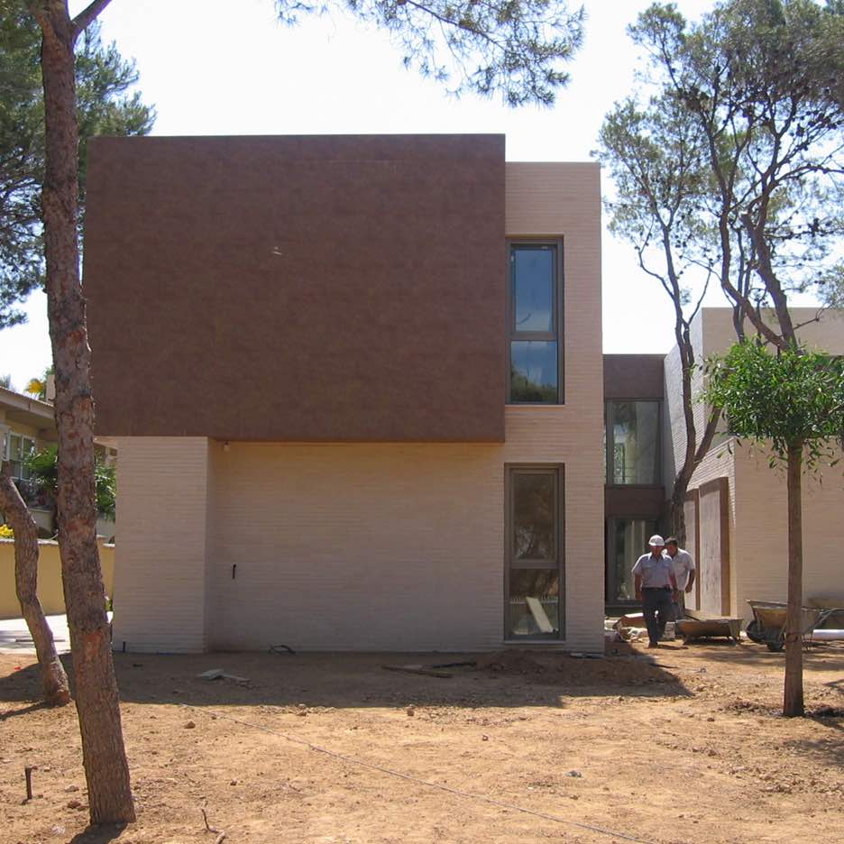 Vivienda Unifamiliar Aislada formado por una edificación de dos plantas sobre rasante con uso propio de vivienda y una zona de garaje. La vivienda en volumen está compuesta por dos paralelepípedos de diferente longitud, que se deslizan entre ellos para generar un atractivo juego de volúmenes, con un interesante juego de luces y sombras. Estos volúmenes alojan las diferentes estancias y en ellos los usos quedan claramente diferenciados. El elemento de unión entre ambos funciona como rótula del esquema, potenciando más aún su funcionalidad al ubicar en este el elemento de circulación vertical entre las dos plantas, quedando también diferenciado en volumen respecto al resto de estancia con el recurso clásico de espacio a doble altura en todo su ámbito. Asimismo, desde este núcleo central se atraviesa al jardín exterior de la parte posterior de la vivienda, que queda vinculado con la zona de juegos de niños.